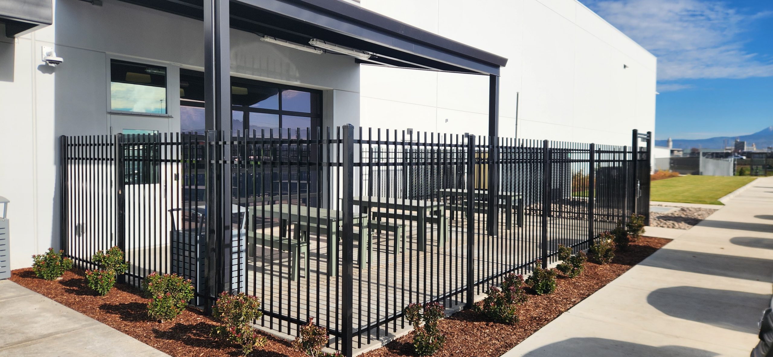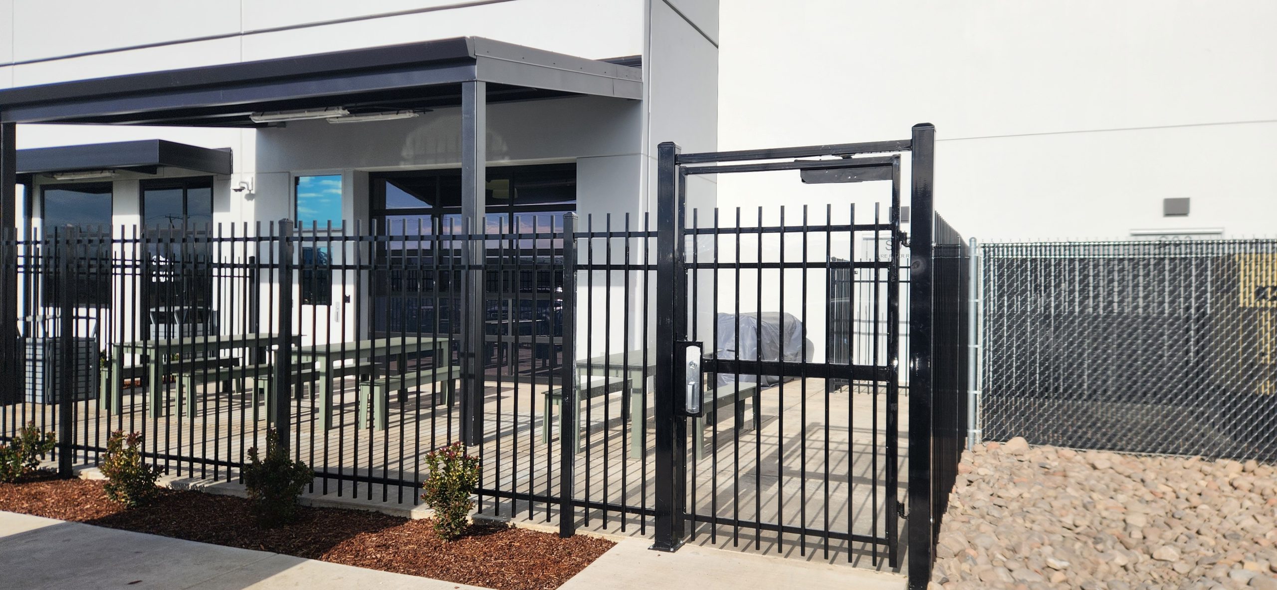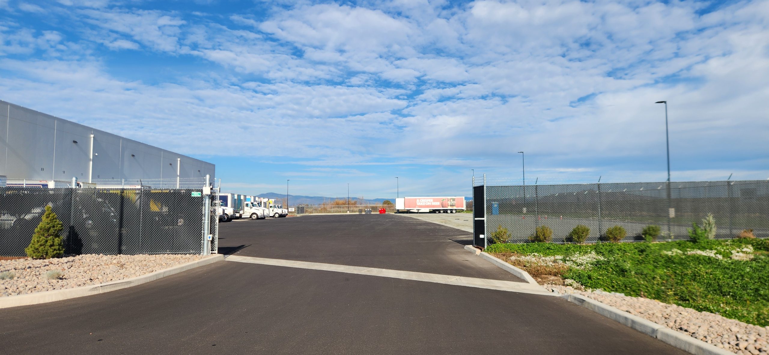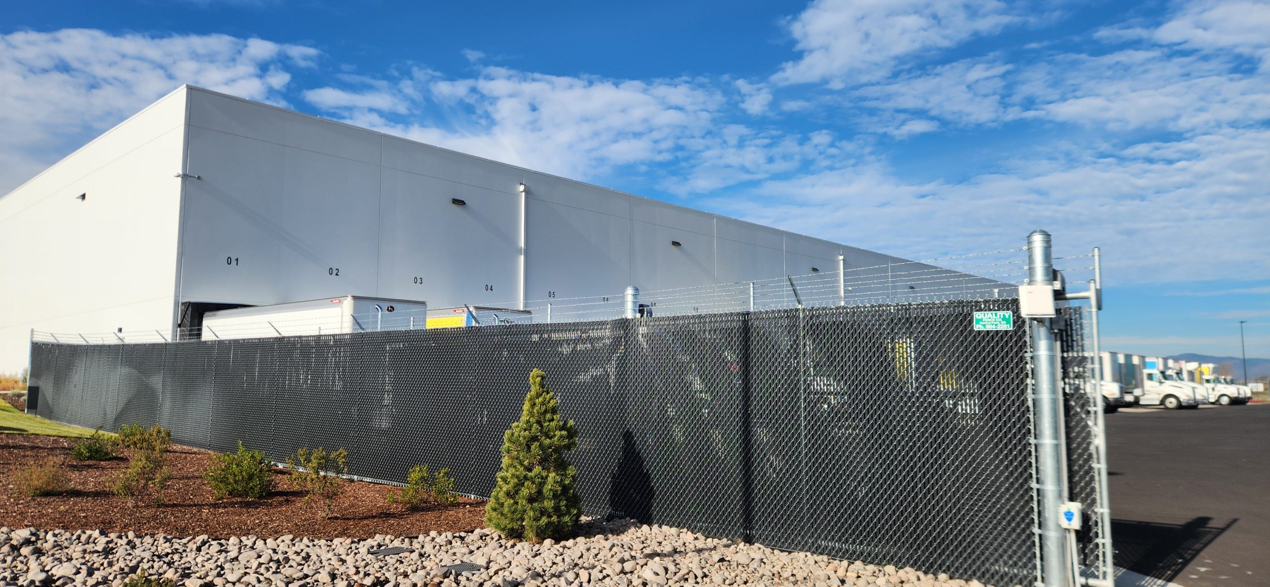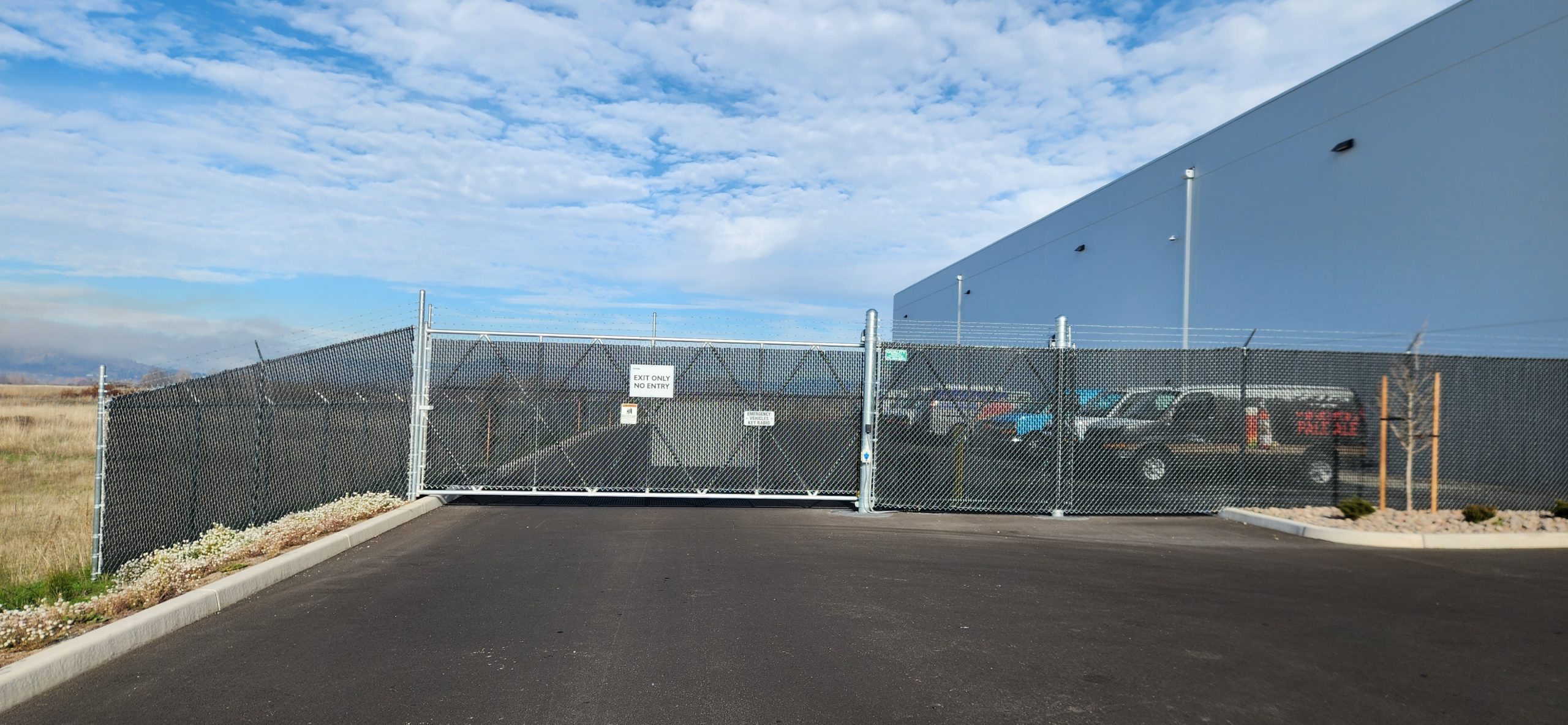 This project for the Columbia Distribution Center included an 8’ high chain-link perimeter fence with three strands of barbed wire, automated entry and exit gates, and an exterior area finished with ornamental iron fencing and a panic gate.